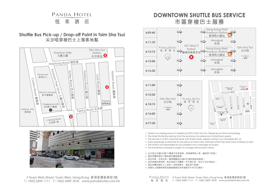 Scheduled bus service between downtown locations, please contact Concierge on 3/F for advance booking.